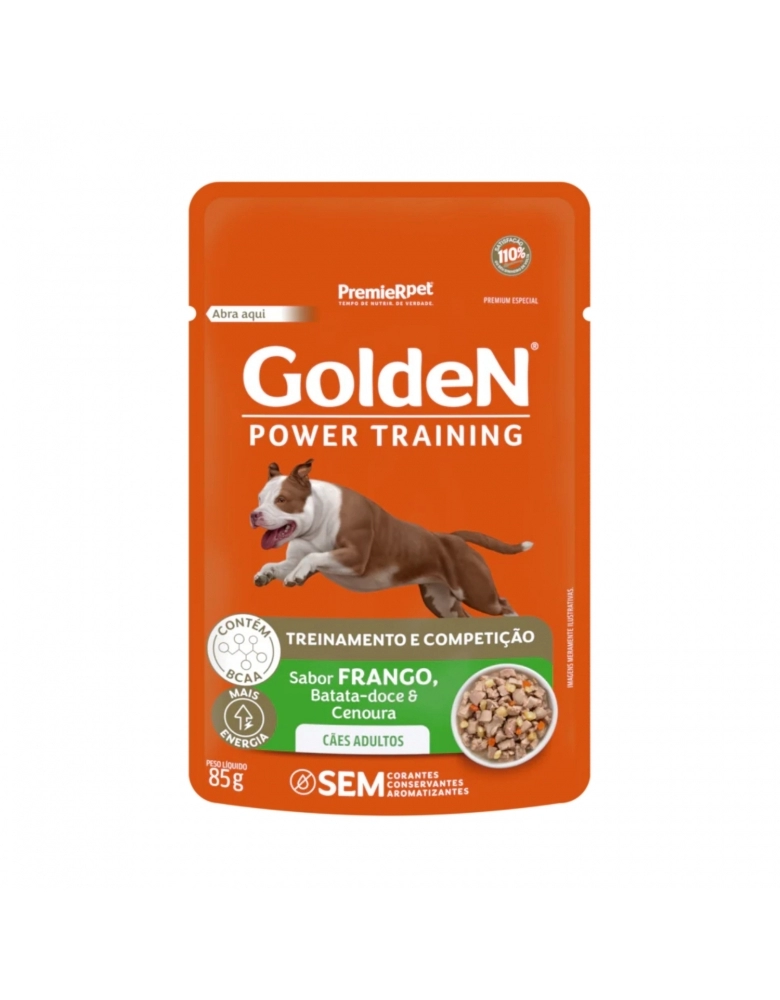 GoldeN Power Training Cães Adultos – Frango, Batata-doce e Cenoura é um alimento Premium Especial úmido completo indicado para cães adultos que praticam atividades físicas e necessitam de mais energia, pois possui BCAA (aminoácidos de cadeia ramificada) e L-carnitina em sua composição, ingredientes que auxiliam na formação da musculatura e no restabelecimento físico após a realização de exercícios. Além disso, GoldeN Power Training Cães Adultos – Frango, Batata-doce e Cenoura possui adição de condroitina e glicosamina, que contribuem para a manutenção da saúde das articulações. Este alimento possui sabor excepcional e é naturalmente saudável, sendo rico em vitaminas e minerais e sem corantes, conservantes e aromatizantes.