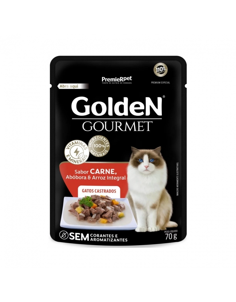 GoldeN Gourmet Gatos Castrados Sabor Carne, Abóbora e Arroz Integral é um alimento Premium Especial que faz parte da linha GoldeN Gourmet. Este produto é um alimento úmido completo indicado para gatos castrados a partir dos 6 meses idade, pois é enriquecido com L-carnitina, vitaminas e minerais, possibilitando um equilíbrio de nutrientes para o gato castrado.