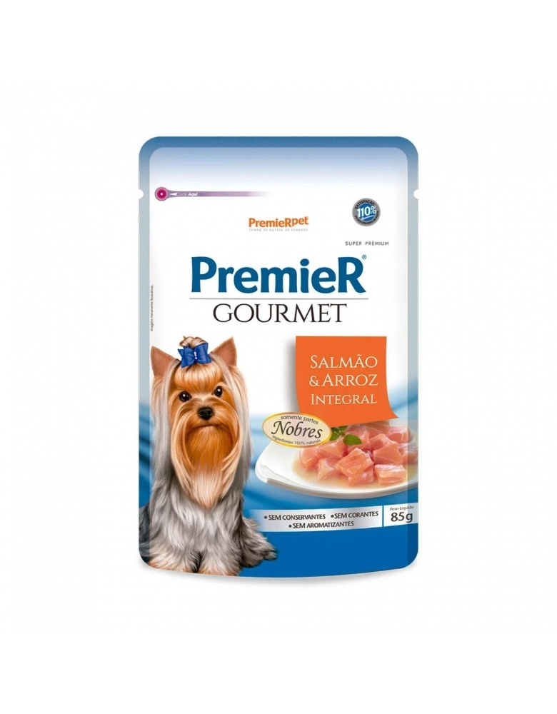 PremieR Gourmet Cães – Salmão e Arroz Integral é um alimento Super Premium que faz parte da linha PremieR Gourmet, uma linha de alimentos úmidos especialmente desenvolvida para retribuir todo amor e carinho que os cães nos proporcionam. PremieR Gourmet Cães Salmão e Arroz Integral é nobre, nutritivo e natural, pois não contém corantes e aromatizantes artificiais, conservantes e nem ingredientes transgênicos.