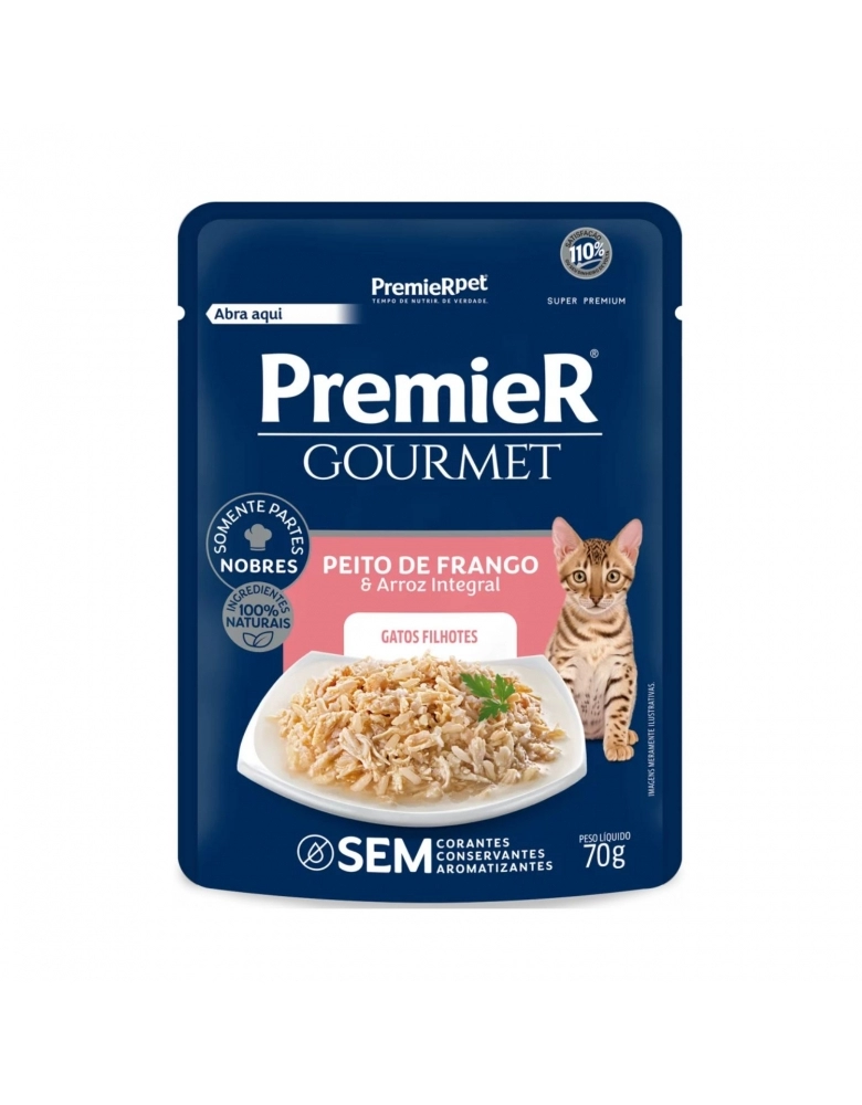 PremieR Gourmet Gatos Filhotes – Peito de Frango e Arroz Integral é formulado com ingredientes nobres, contém um delicioso molho de sabor incomparável, além de ser enriquecido com vitaminas e prebióticos.