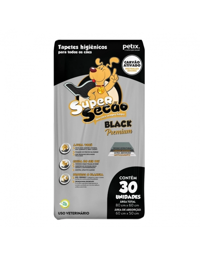 O tapete Super Secão Black tem em sua composição: carvão ativado que ajuda a combater o mal cheiro do xixi. polímeros superabsorventes que garantem melhor absorção e fita adesiva de alta fixação. Além disso, o tapete Super Secão Black possui atrativo canino.