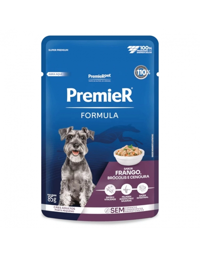 PremieR® Formula Úmido Cães Adultos Porte Pequeno Frango 85 g é um alimento super premium, completo, balanceado e com sabor irresistível. Elaborado com ingredientes de alta qualidade, contribui com a saúde do intestino, da pele e da pelagem. Além disso, é livre de ingredientes transgênicos, corantes, conservantes e aromatizantes artificiais. Nutritivo, saudável e delicioso.