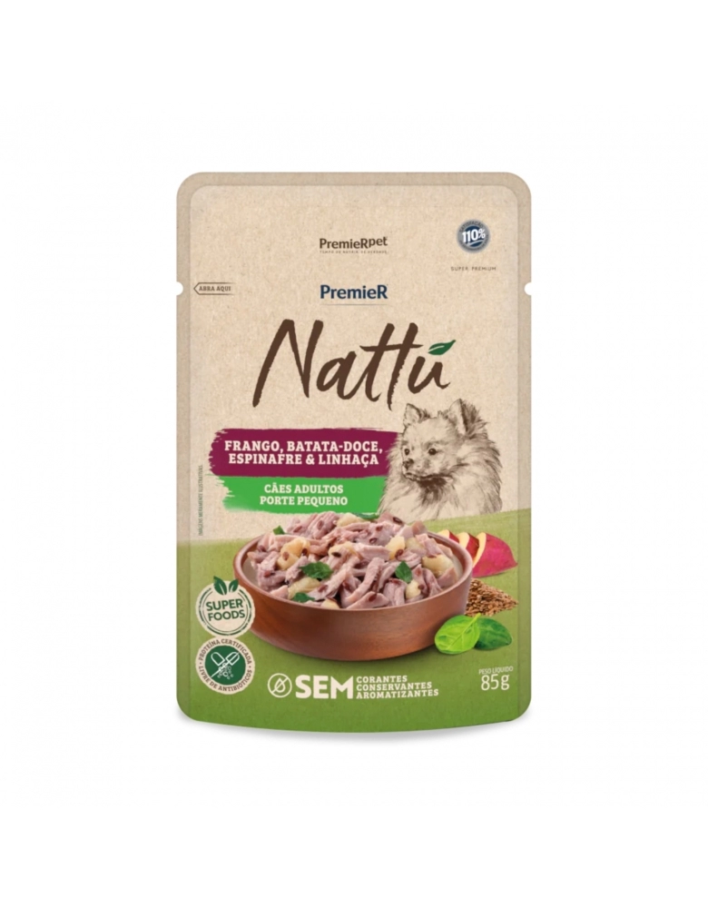 Com uma fórmula sem corantes, conservantes e aromatizantes, PremieR® Nattu – Frango, Batata-doce, Espinafre e Linhaça é recomendado como petisco para cães adultos de porte pequeno. Este alimento é preparado com frango desfiado, vegetais e grãos selecionados, em um molho irresistível.