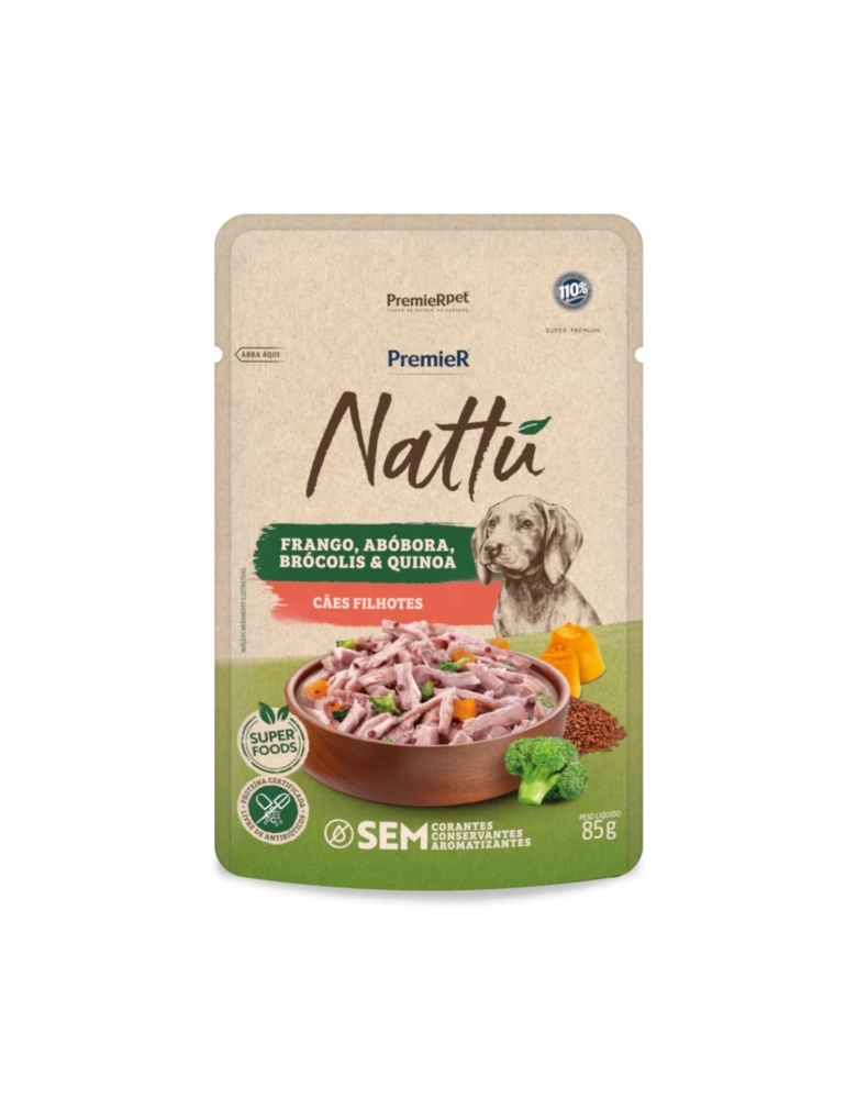 Com uma fórmula sem corantes, conservantes e aromatizantes, PremieR® Nattu – Frango, Abóbora, Brócolis e Quinoa é recomendado como petisco para cães filhotes. Este alimento é preparado com frango desfiado, vegetais e grãos selecionados, em um molho irresistível.