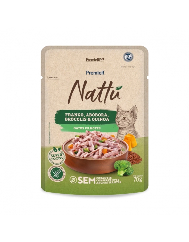 Com uma fórmula sem corantes, conservantes e aromatizantes, PremieR® Nattu – Frango, Abóbora, Brócolis e Quinoa é recomendado como petisco para gatos filhotes. Este alimento é preparado com frango desfiado, vegetais e grãos selecionados, em um molho irresistível.
