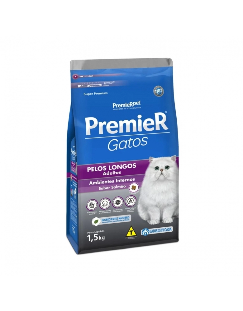 PremieR Gatos Adultos Pelos Longos – Salmão oferece ao seu gato adulto de pelos longos um cuidado especial todos os dias. Através de uma combinação de ingredientes nobres, realça a beleza da pelagem, tornando-a exuberante e macia. No entanto, esses pelos densos podem predispor à formação das “bolas de pelos”, essas são resultado do acúmulo de pelos no trato digestivo pelo hábito de se lamber dos felinos. PremieR Gatos Adultos Pelos Longos – Salmão traz em sua fórmula fibras selecionadas como a aveia e polpa de beterraba que previnem a formação dessas indesejáveis “bolas de pelos”.