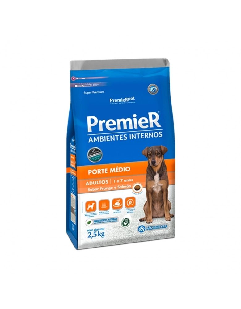 PremieR Ambientes Internos Cães Adultos Porte Médio – Sabor Frango e Salmão é um alimento Super Premium recomendado para cães com este estilo de vida.