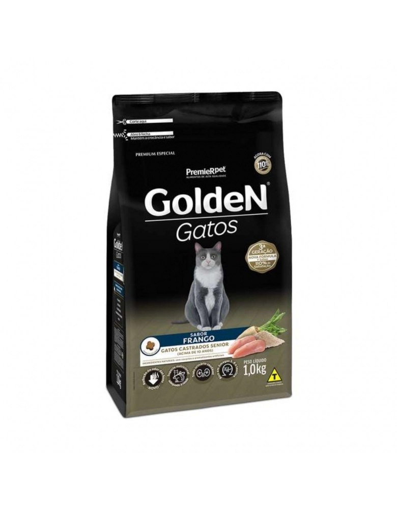 GoldeN Gatos Castrados Senior foi especialmente formulada para atender às necessidades dos gatos castrados a partir de 10 anos de idade. Oferece um suporte nutricional adequado à idade, através de um balanço de nutrientes ajustado ao gato senior. Por ser rico em ômegas 3 e 6 e taurina, auxilia nos cuidados com a pele, pelagem, coração e visão. Promove ainda o cuidado com o trato urinário, garantindo uma nutrição ótima e saudável para esta fase da vida do animal.