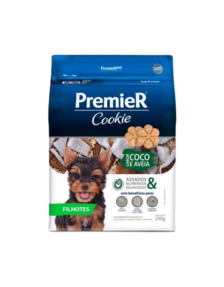 PremieR Cookie Cães Filhotes Pequeno Porte Coco e Aveia é indicado para cães filhotes de pequeno porte e contém todos os benefícios da linha PremieR Cookies aliados à exclusiva combinação do coco e aveia, ingredientes saudáveis e que promovem ainda mais sabor aos biscoitos.