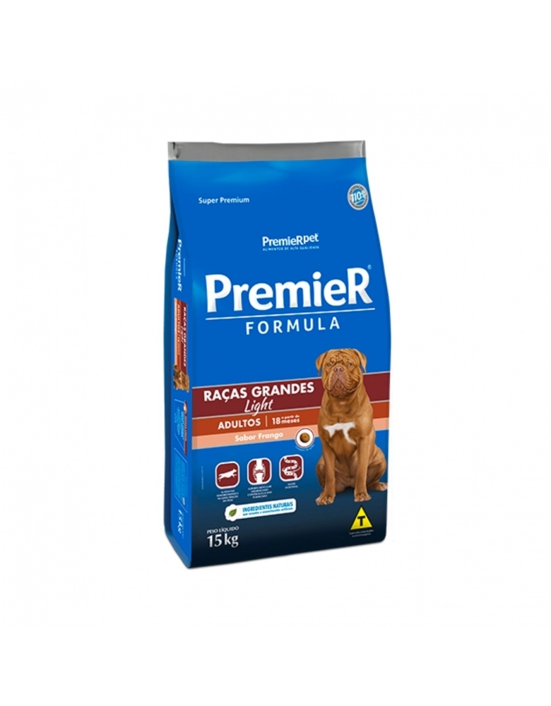 PremieR Fórmula Adultos Raças Grandes Light é um alimento SuperPremium cientificamente formulado para cães grandes e gigantes que estão acima do peso ou com maior predisposição à obesidade.