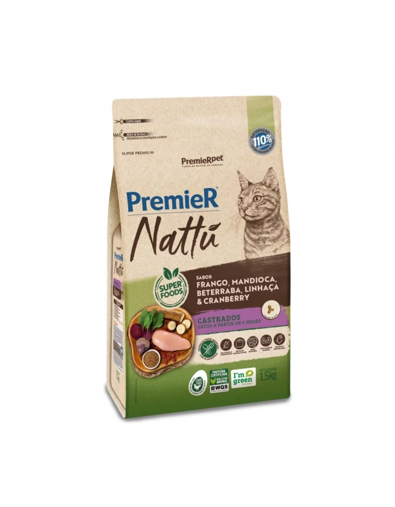 Formulado com ingredientes nobres, sem corantes e aromatizantes artificiais, PremieR Nattu Gatos Castrados é recomendado a partir dos 6 meses de idade para os felinos que passaram por este procedimento cirúrgico e que necessitam de uma dieta equilibrada.