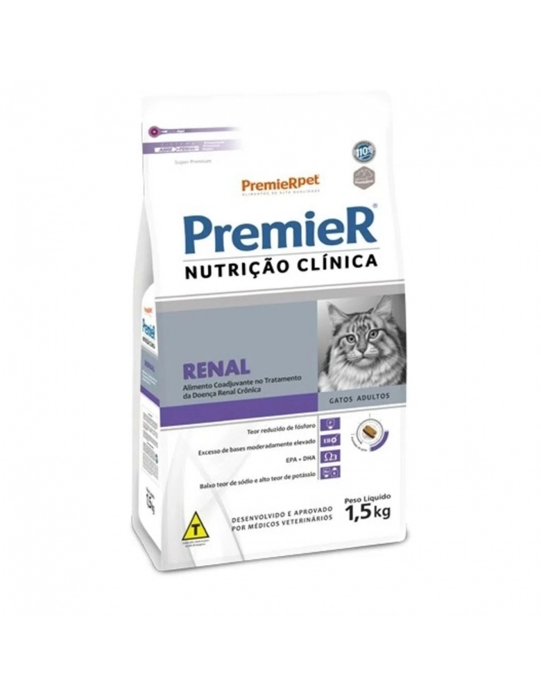 PremieR Nutrição Clínica Gatos Renal é um alimento Super Premium auxiliar ao tratamento da doença renal crônica dos gatos. Além do tratamento prescrito pelo médico veterinário, algumas alterações na alimentação podem ser benéficas para pacientes com doença renal crônica.