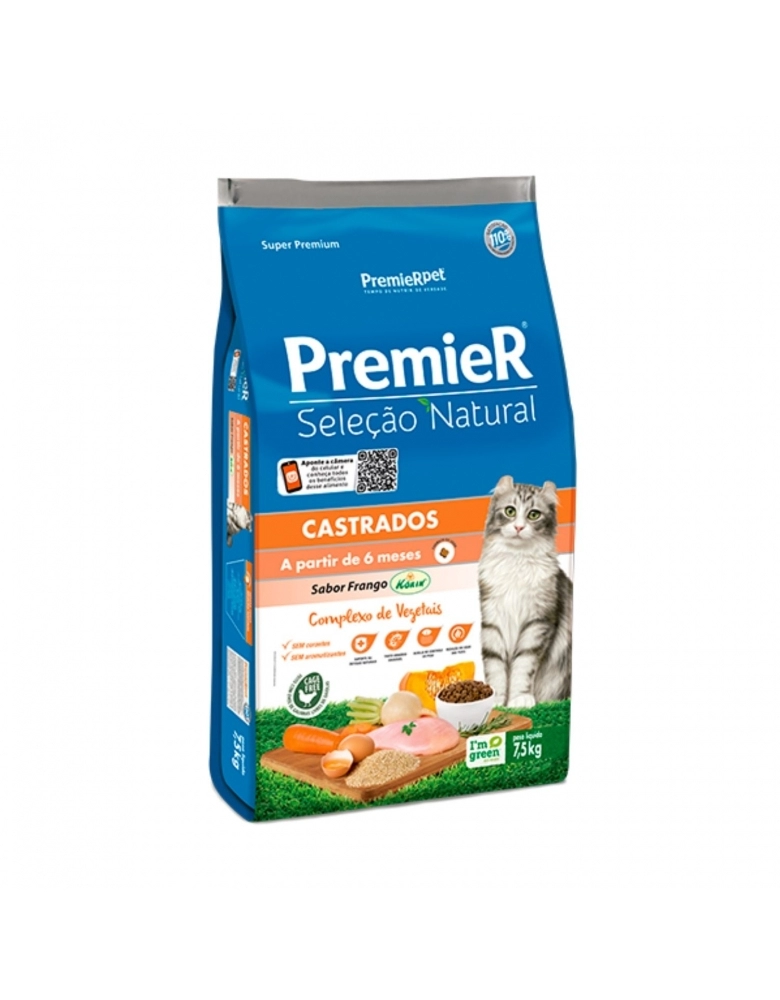 PremieR Seleção Natural Gatos Castrados é recomendado para gatos castrados a partir de 6 meses de idade. Este produto oferece suporte às defesas naturais, promove o cuidado do trato urinário e auxilia no controle do peso, através de teores moderados de calorias e gorduras, além da L-carnitina que auxilia na conservação da massa muscular.