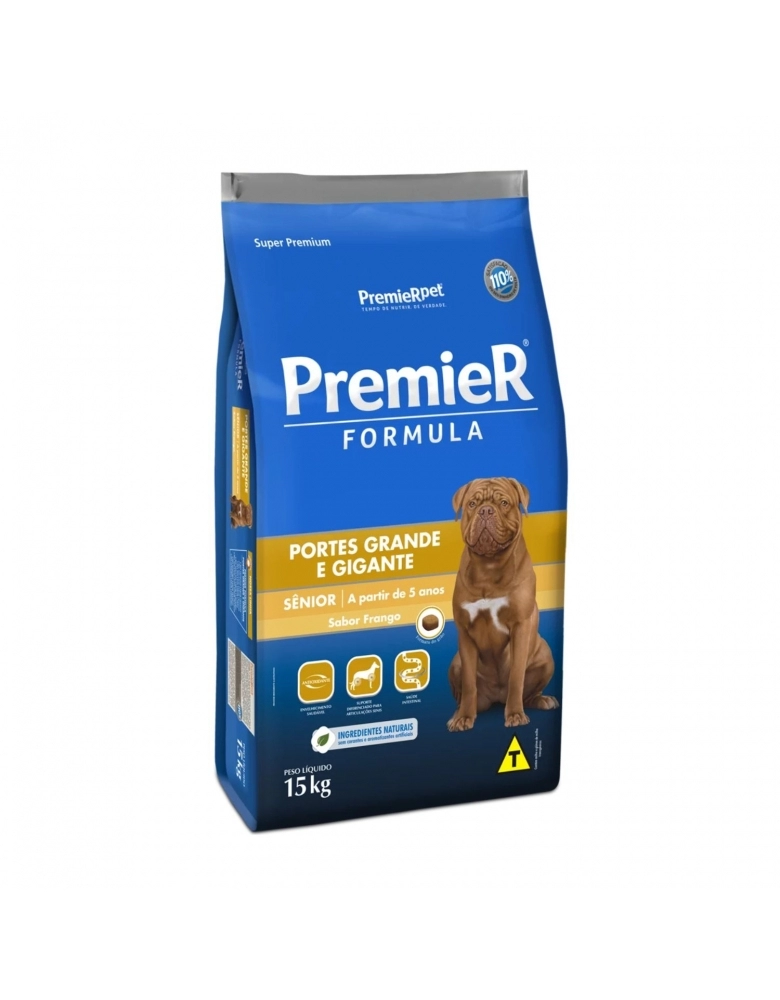 PremieR Formula Cães Sênior Portes Grande e Gigante Sabor Frango é um alimento Super Premium desenvolvido com base nas necessidades dos cães grandes e gigantes com mais de cinco anos de idade, oferecendo saúde, bem-estar e longevidade.