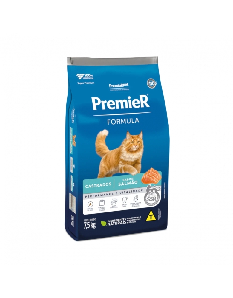 PremieR® Formula Gatos Castrados Sabor Salmão contribui para a prevenção dos principais tipos de cálculos urinários por meio do método SSR, tecnologia aplicada ao produto e que proporciona um trato urinário saudável para o animal, sendo contraindicado para filhotes de idade inferior a 6 meses, fêmeas gestantes e lactantes, devido ao seu reduzido teor calórico.