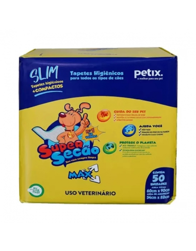 Mantenha a higiene do seu pet de forma eficiente com o Tapete Higiênico Petix Super Secão Max Slim. Desenvolvido com material de alta qualidade para máxima absorção, evitando o chão molhado. Fixação fácil com fitas adesivas em todas as extremidades do tapete, que podem ser coladas no piso ou na parede, caso seu pet levante a pata para fazer xixi. Prevenção de mau cheiro e sem patas molhadas pelo chão, mantendo a sua casa sempre limpa. Ideal para tutores em dias chuvosos ou com pouco tempo para passeios. Composição: Celulose, Polietileno, Fragrância e Atrativo Canino. Prático, eficaz e amigo do ambiente, o tapete perfeito para o conforto do seu pet.