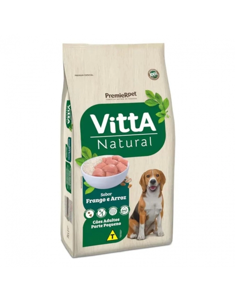 A linha Vitta Natural é formulada com proteínas de alta qualidade e é enriquecida com todas as vitaminas e minerais necessários para que os cães vivam saudáveis e felizes. Elaborado com ingredientes naturais e cuidadosamente selecionados, o produto Vitta Natural Adultos Raças Pequenas Seleção de Carnes e Arroz, além de muito saboroso, não possui corantes e aromatizantes artificiais. Promove também a saúde intestinal, através da associação de fibras naturais com prebiótico, e auxilia para uma pelagem bonita, pela presença do ômega 6.-